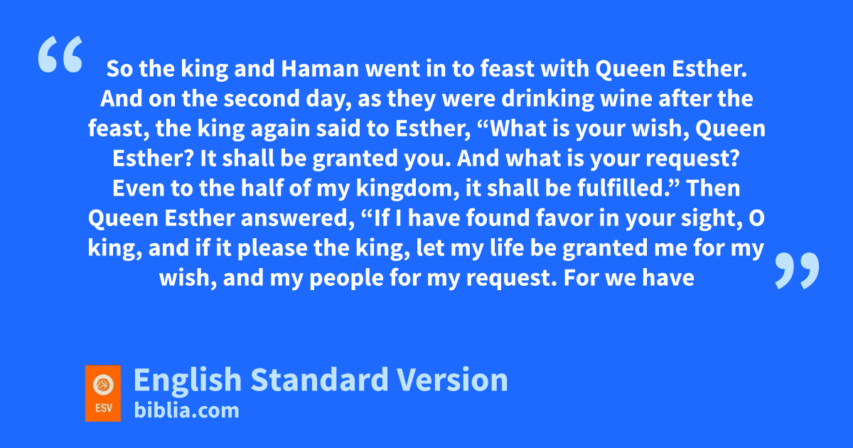 7 So the king and Haman went in to feast with Queen Esther. 2 And on the second day, as they were drinking wine after the feast, the king again said to Esther, c“What is your wish, Queen Esther? It shall be granted you. And what is your request? dEven to the half of my kingdom, it shall be fulfilled.” 3 Then Queen Esther answered, e“If I have found favor in your sight, O king, and if it please the king, let my life be granted me for my wish, and my people for my request. 4 fFor we have been sold, I and my people, gto be destroyed, to be killed, and to be annihilated. If we had been sold merely as slaves, men and women, I would have been silent, for our affliction is not to be compared with the loss to the king.” 5 Then King Ahasuerus said to Queen Esther, “Who is he, and where is he, who has dared1 to do this?” 6 And Esther said, h“A foe and enemy! This wicked Haman!” Then Haman was terrified before the king and the queen.