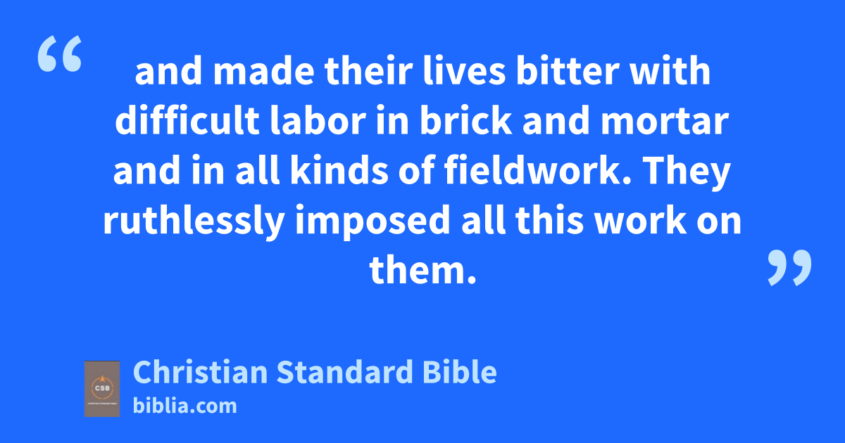 8 A new king, who did not know about Joseph, came to power in Egypt. 9 He said to his people, “Look, the Israelite people are more numerous and powerful than we are.e 10 Come, let’s deal shrewdly with them; otherwise they will multiply further, and when war breaks out, they will join our enemies, fight against us, and leave the country.”f 11 So the Egyptians assigned taskmasters over the Israelites to oppress them with forced labor.g They built Pithom and Rameses as supply citiesh for Pharaoh. 12 But the more they oppressed them, the more they multiplied and spread so that the Egyptians came to dreadC the Israelites. 13 They worked the Israelites ruthlesslyi 14 and made their lives bitter with difficult labor in brick and mortar and in all kinds of fieldwork. They ruthlessly imposed all this work on them.j