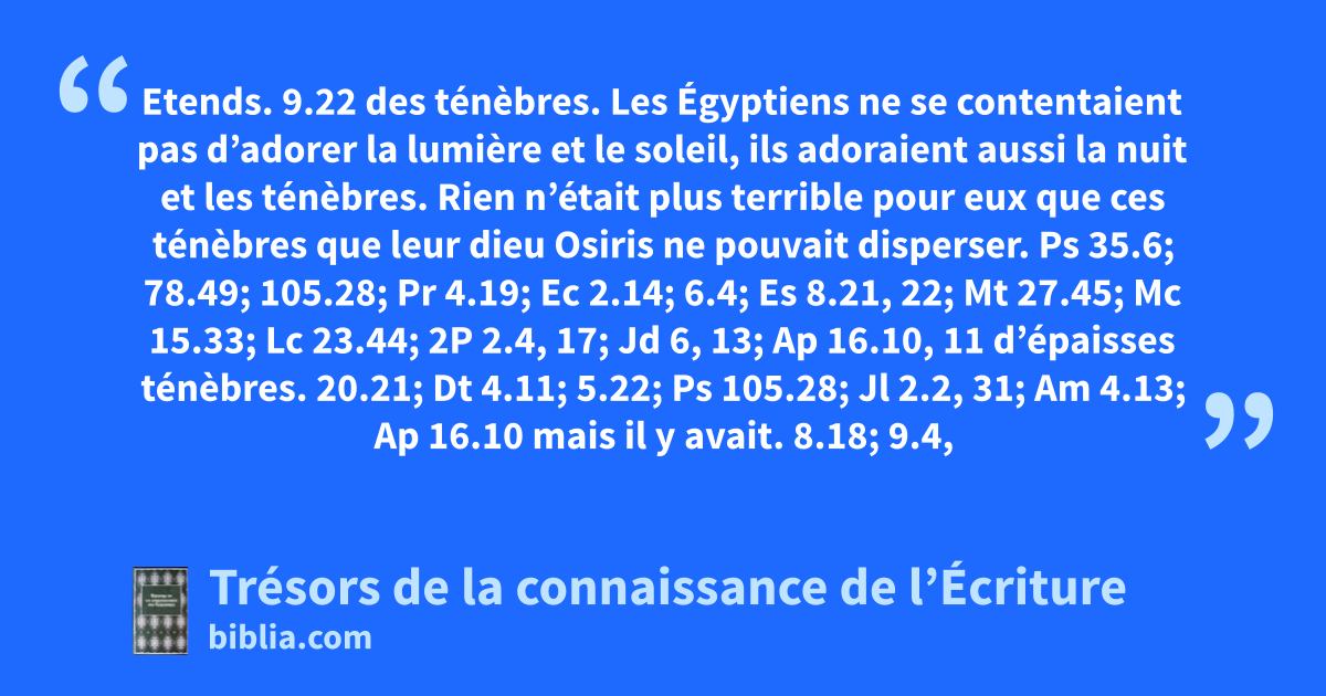 Etends. 9.22 des ténèbres. Les Égyptiens ne se contentaient pas d’adorer la lumière et le soleil, ils adoraient aussi la nuit et les ténèbres. Rien n’était plus terrible pour eux que ces ténèbres que leur dieu Osiris ne pouvait disperser. Ps 35.6; 78.49; 105.28; Pr 4.19; Ec 2.14; 6.4; Es 8.21, 22; Mt 27.45; Mc 15.33; Lc 23.44; 2P 2.4, 17; Jd 6, 13; Ap 16.10, 11