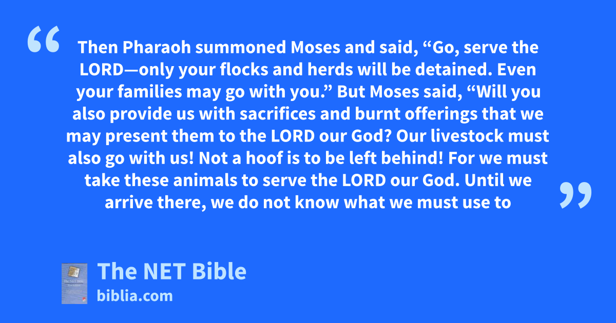 10:25 But Moses said, “Will you also71 provide us72 with sacrifices and burnt offerings that we may present them73 to the Lord our God? 10:26 Our livestock must74 also go with us! Not a hoof is to be left behind! For we must take75 these animals76 to serve the Lord our God. Until we arrive there, we do not know what we must use to serve the Lord.”77