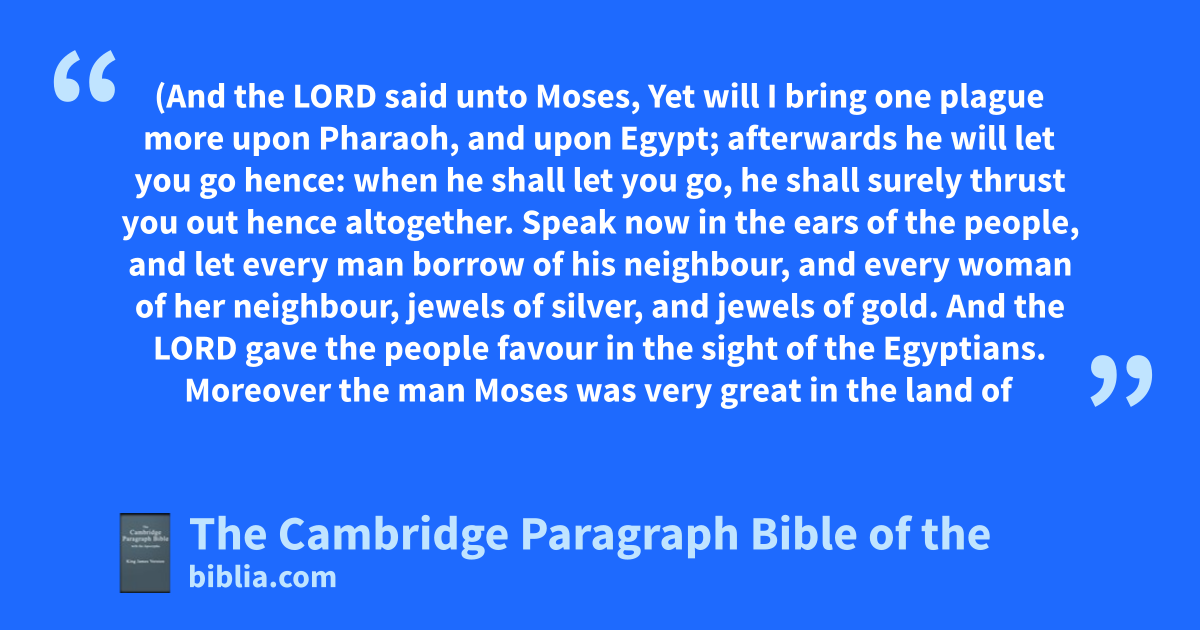 XI. (And the Lord said unto Moses, Yet will I bring aone plague more upon Pharaoh, and upon Egypt; afterwards he will let you go hence: bwhen he shall let you go, he shall surely thrust you out hence altogether. 2 Speak now in the ears of the people, and let every man cborrow of his neighbour, and every woman of her neighbour, jewels of silver, and jewels of gold. 3 dAnd the Lord gave the people favour in the sight of the Egyptians. Moreover the man eMoses was very great in the land of Egypt, in the sight of Pharaoh’s servants, and in the sight of the people.) 4 And Moses said, Thus saith the Lord, fAbout midnight will I go out into the midst of Egypt: 5 and all the firstborn in the land of Egypt shall die, from the firstborn of Pharaoh that sitteth upon his throne, even unto the firstborn of the maidservant gthat is behind the mill; and all the firstborn of beasts. 6 hAnd there shall be a great cry throughout all the land of Egypt, such as there was none like it, nor shall be like it any more. 7 iBut against any of the children of Israel kshall not a dog move his tongue, against man or beast: that ye may know how that the Lord doth put a difference between the Egyptians and Israel. 8 And lall these thy servants shall come down unto me, and bow down themselves unto me, saying, Get thee out, and all the people * that follow thee: and after that I will go out. And he went out from Pharaoh in * a great anger. 9 And the Lord said unto Moses, mPharaoh shall not hearken unto you; that nmy wonders may be multiplied in the land of Egypt. 10 And Moses and Aaron did all these wonders before Pharaoh: oand the Lord hardened Pharaoh’s heart, so that he would not let the children of Israel go out of his land.