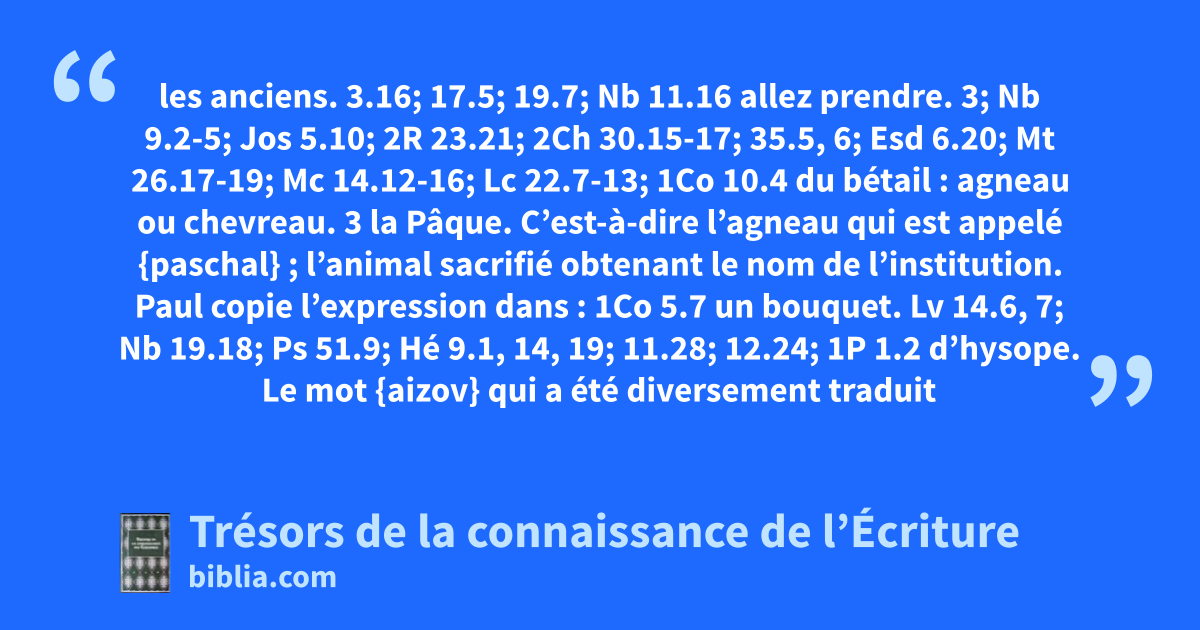 les anciens. 3.16; 17.5; 19.7; Nb 11.16 allez prendre. 3; Nb 9.2-5; Jos 5.10; 2R 23.21; 2Ch 30.15-17; 35.5, 6; Esd 6.20; Mt 26.17-19; Mc 14.12-16; Lc 22.7-13; 1Co 10.4 du bétail : agneau ou chevreau. 3 la Pâque. C’est-à-dire l’agneau qui est appelé {paschal} ; l’animal sacrifié obtenant le nom de l’institution. Paul copie l’expression dans : 1Co 5.7