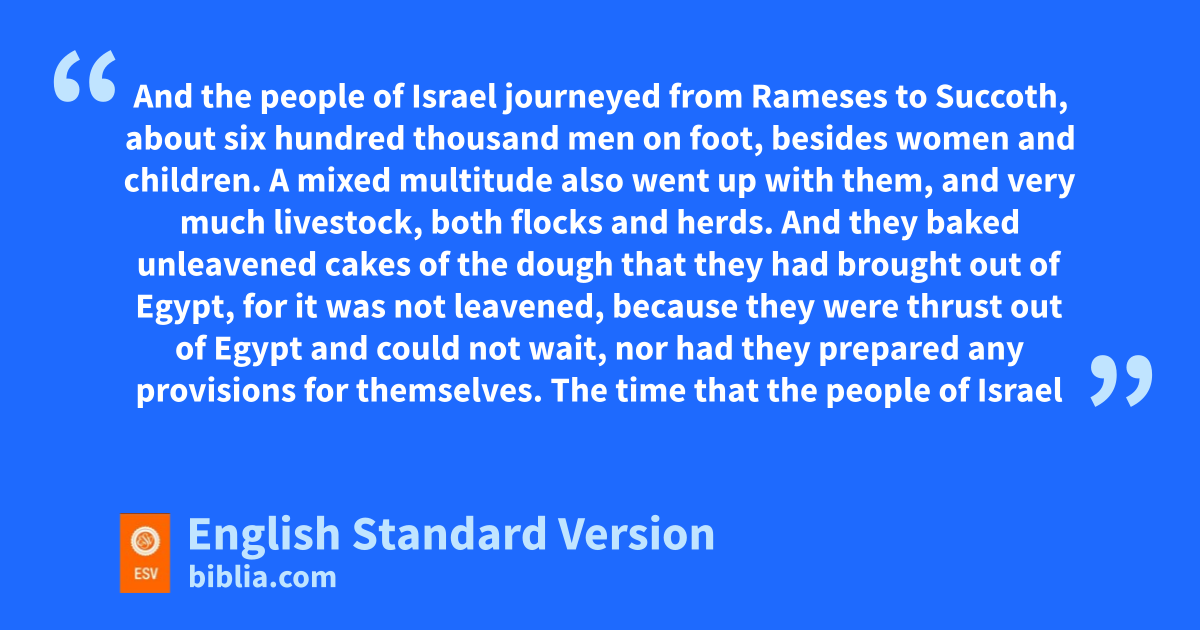 37 And the ypeople of Israel journeyed from zRameses to Succoth, aabout six hundred thousand men on foot, besides women and children. 38 A bmixed multitude also went up with them, and very much livestock, both flocks and herds. 39 And they baked unleavened cakes of the dough that they had brought out of Egypt, for it was not leavened, because uthey were thrust out of Egypt and ccould not wait, nor had they prepared any provisions for themselves.