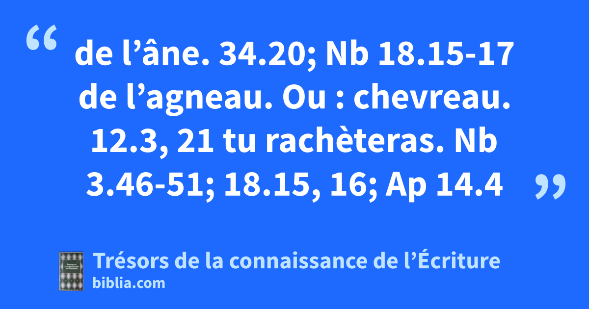 de l’âne. 34.20; Nb 18.15-17 de l’agneau. Ou : chevreau. 12.3, 21 tu rachèteras. Nb 3.46-51; 18.15, 16; Ap 14.4