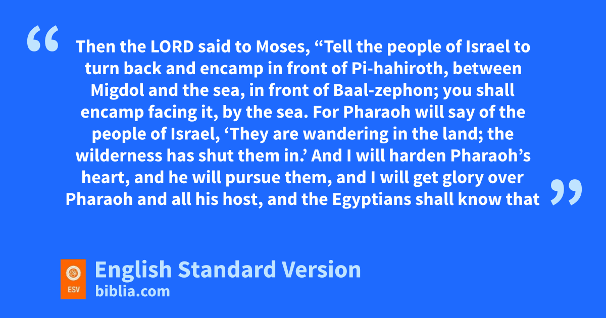 14 Then the Lord said to Moses, 2 “Tell the people of Israel to tturn back and encamp in front of Pi-hahiroth, between uMigdol and the sea, in front of Baal-zephon; you shall encamp facing it, by the sea. 3 For Pharaoh will say of the people of Israel, ‘They are wandering in the land; the wilderness has shut them in.’ 4 And vI will harden Pharaoh’s heart, and he will pursue them, and I will wget glory over Pharaoh and all his host, xand the Egyptians shall know that I am the Lord.” And they did so.