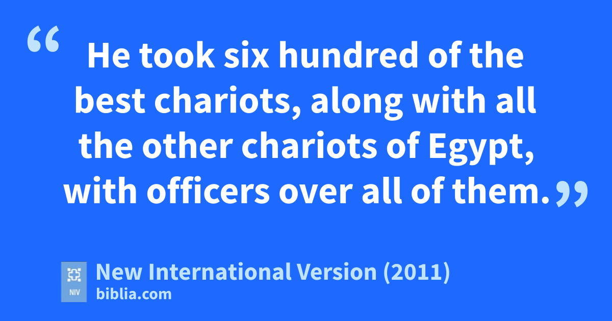 5 When the king of Egypt was told that the people had fled,r Pharaoh and his officials changed their mindss about them and said, “What have we done? We have let the Israelites go and have lost their services!” 6 So he had his chariot made ready and took his army with him. 7 He took six hundred of the best chariots,t along with all the other chariots of Egypt, with officers over all of them. 8 The Lord hardened the heartu of Pharaoh king of Egypt, so that he pursued the Israelites, who were marching out boldly.v 9 The Egyptians—all Pharaoh’s horsesw and chariots, horsemena and troopsx—pursued the Israelites and overtooky them as they camped by the sea near Pi Hahiroth, opposite Baal Zephon.z