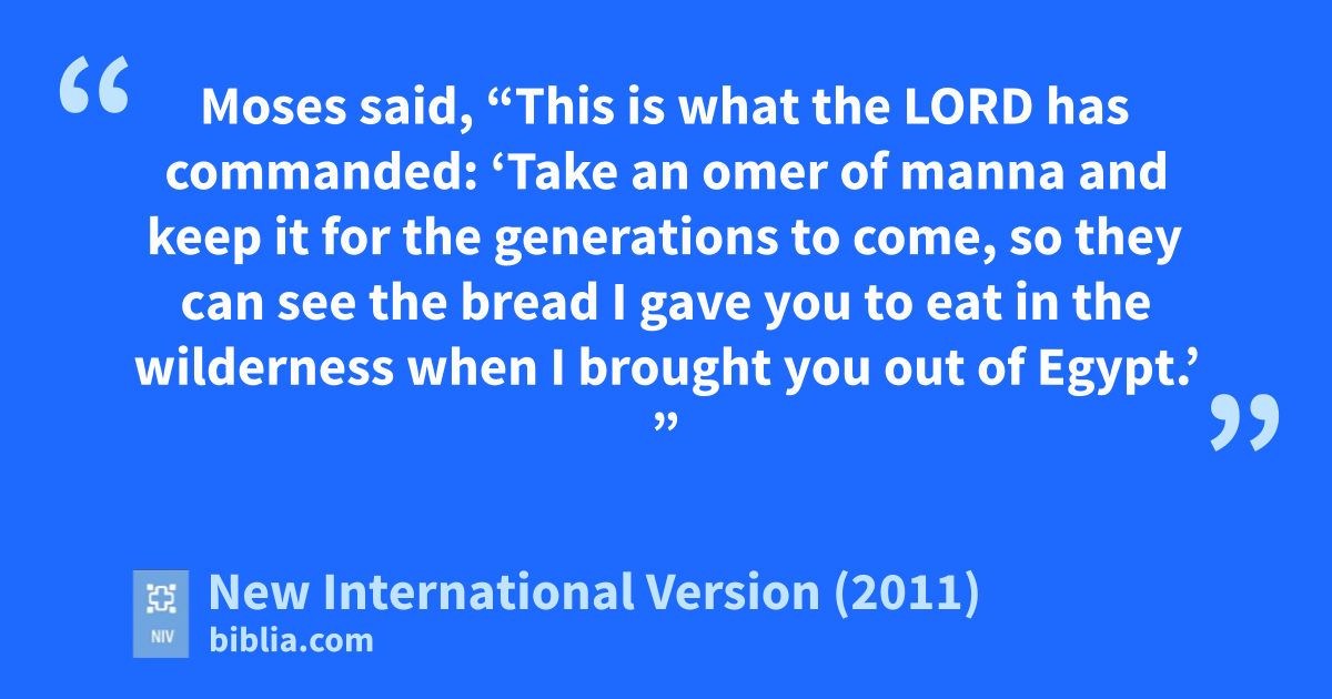 31 The people of Israel called the bread manna.d v It was white like coriander seed and tasted like wafers made with honey. 32 Moses said, “This is what the Lord has commanded: ‘Take an omer of manna and keep it for the generations to come, so they can see the bread I gave you to eat in the wilderness when I brought you out of Egypt.’ ”