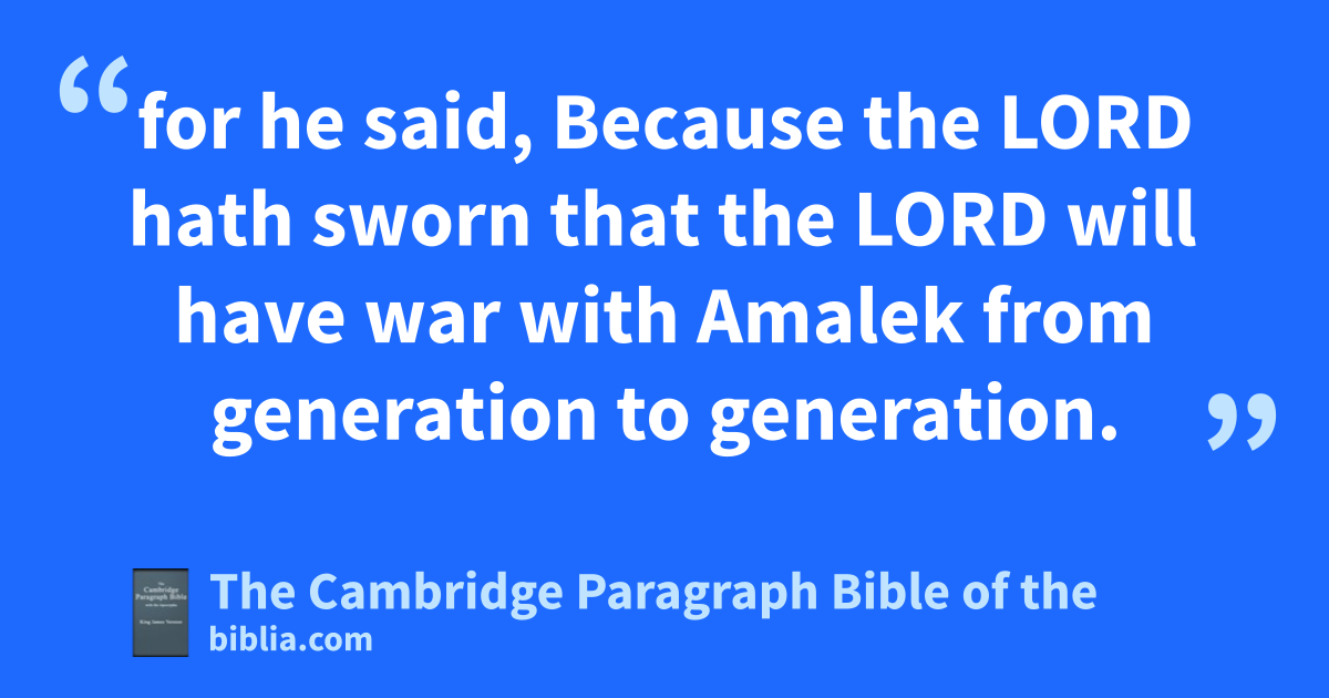 8 lThen came Amalek, and fought with Israel in Rephidim. 9 And Moses said unto mJoshua, Choose us out men, and go out, fight with Amalek: to morrow I will stand on the top of the hill with nthe rod of God in mine hand. 10 So Joshua did as Moses had said to him, and fought with Amalek: and Moses, Aaron, and Hur went up to the top of the hill. 11 And it came to pass, when Moses held up his hand, that Israel prevailed: and when he let down his hand, Amalek prevailed. 12 But Moses’ hands were heavy; and they took a stone, and put it under him, and he sat thereon; and Aaron and Hur stayed up his hands, the one on the one side, and the other on the other side; and his hands were steady until the going down of the sun. 13 And Joshua discomfited Amalek and his people with the edge of the sword. 14 And the Lord said unto Moses, oWrite this for a memorial in a book, and rehearse it in the ears of Joshua: for pI will utterly put out the remembrance of Amalek from under heaven. 15 And Moses built an altar, and called the name of it * Jehovah-nissi: 16 for he said, * Because * the Lord hath sworn that the Lord will have war with Amalek from generation to generation.