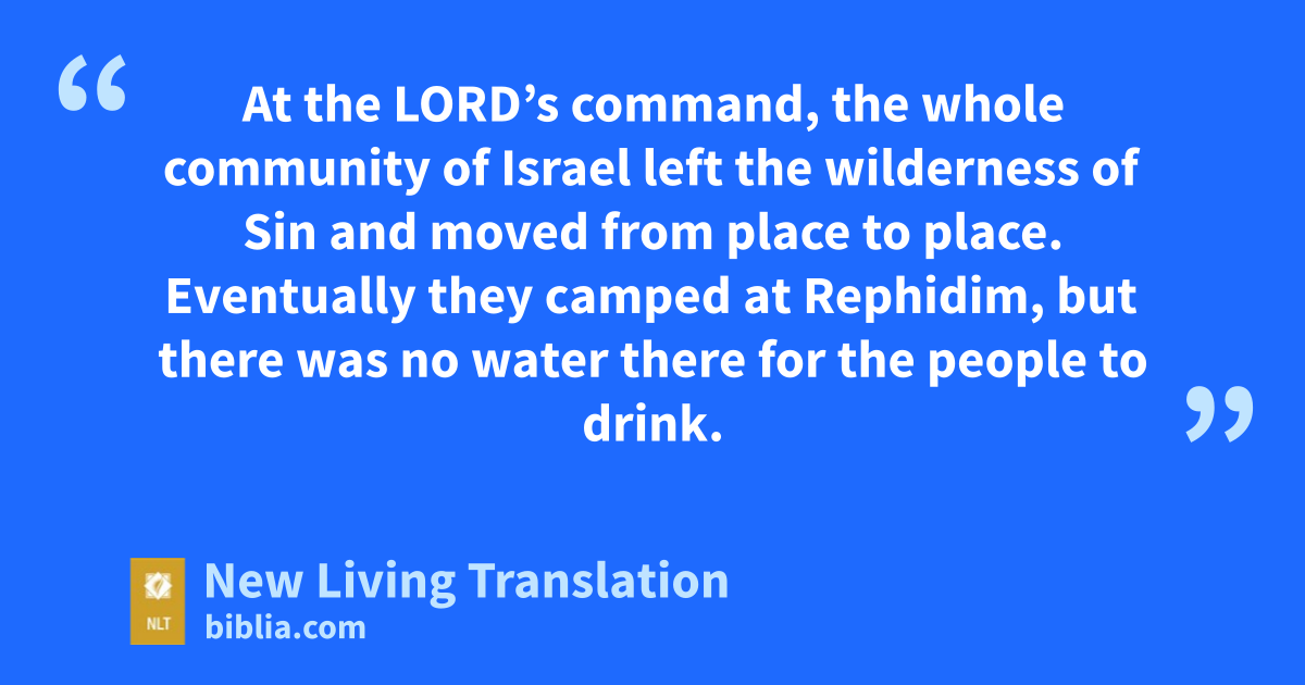 At the Lord’s command, the whole community of Israel left the wilderness of Sin* and moved from place to place. Eventually they camped at Rephidim, but there was no water there for the people to drink. 2 So once more the people complained against Moses. “Give us water to drink!” they demanded.