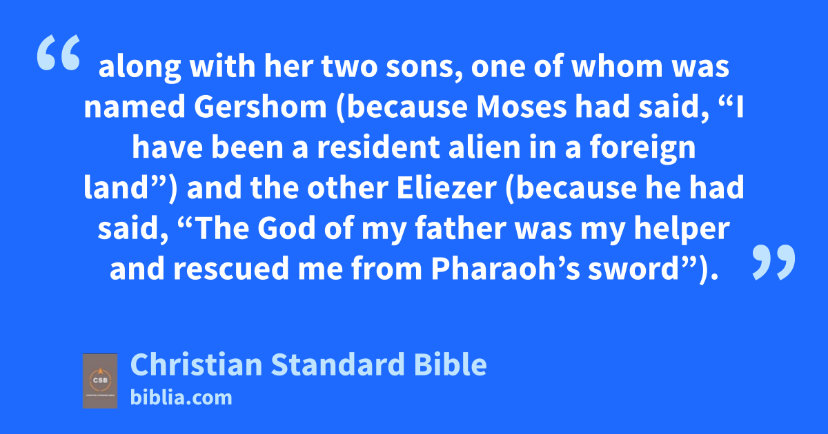 2 Now Jethro, Moses’s father-in-law, had taken in Zipporah,m Moses’s wife, after he had sent her back, 3 along with her two sons, one of whom was named GershomD (because Moses had said, “I have been a resident alien in a foreign land”)n 4 and the other Eliezer (because he had said, “The God of my father was my helper and rescued me from Pharaoh’s sword”).E