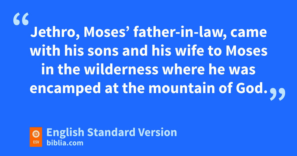 18 mJethro, nthe priest of Midian, Moses’ father-in-law, heard of all that God had done for Moses and for Israel his people, how the Lord had brought Israel out of Egypt. 2 Now Jethro, Moses’ father-in-law, had taken Zipporah, Moses’ wife, after he had sent her home, 3 along with her otwo sons. The name of the one was Gershom (pfor he said, q“I have been a sojourner1 in a foreign land”), 4 and the name of the other, Eliezer2 (for he said, “The God of my father was my help, and delivered me from the sword of Pharaoh”). 5 Jethro, Moses’ father-in-law, came with his sons and his wife to Moses in the wilderness where he was encamped at the rmountain of God. 6 And when he sent word to Moses, “I,3 your father-in-law Jethro, am coming to you with your wife and her two sons with her,” 7 Moses swent out to meet his father-in-law and bowed down and tkissed him. And they asked each other of their welfare and went into the tent. 8 Then Moses told his father-in-law uall that the Lord had done to Pharaoh and to the Egyptians for Israel’s sake, all the hardship that had come upon them in the way, and how the Lord had delivered them. 9 And Jethro rejoiced for all the good that the Lord had done to Israel, in that he had delivered them out of the hand of the Egyptians.