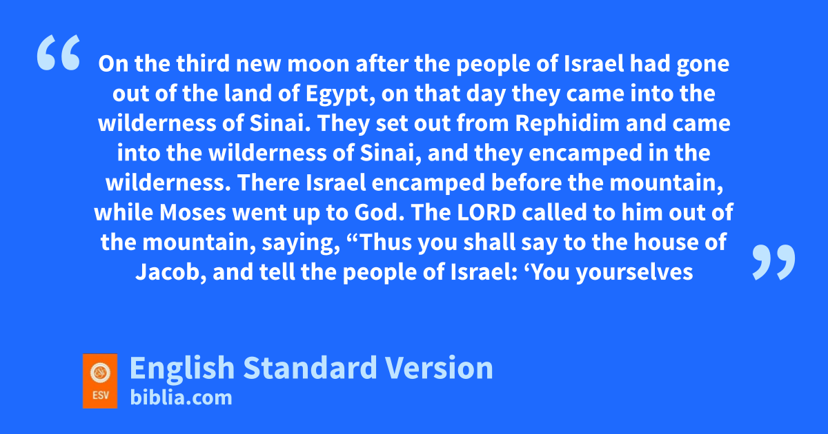 19 On the third new moon after the people of Israel had gone out of the land of Egypt, on that day they pcame into the wilderness of Sinai. 2 They set out from qRephidim and came into the wilderness of Sinai, and they encamped in the wilderness. There Israel encamped before rthe mountain, 3 while sMoses went up to God. tThe Lord called to him out of the mountain, saying, “Thus you shall say to the house of Jacob, and tell the people of Israel: 4 u‘You yourselves have seen what I did to the Egyptians, and how vI bore you on eagles’ wings and brought you to myself. 5 Now therefore, if you will indeed obey my voice and keep my covenant, you shall be wmy treasured possession among all peoples, for xall the earth is mine; 6 and you shall be to me a ykingdom of priests and za holy nation.’ These are the words that you shall speak to the people of Israel.”
