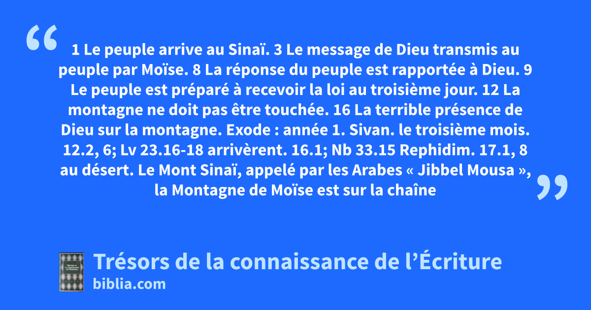 1 Le peuple arrive au Sinaï. 3 Le message de Dieu transmis au peuple par Moïse. 8 La réponse du peuple est rapportée à Dieu. 9 Le peuple est préparé à recevoir la loi au troisième jour. 12 La montagne ne doit pas être touchée. 16 La terrible présence de Dieu sur la montagne.