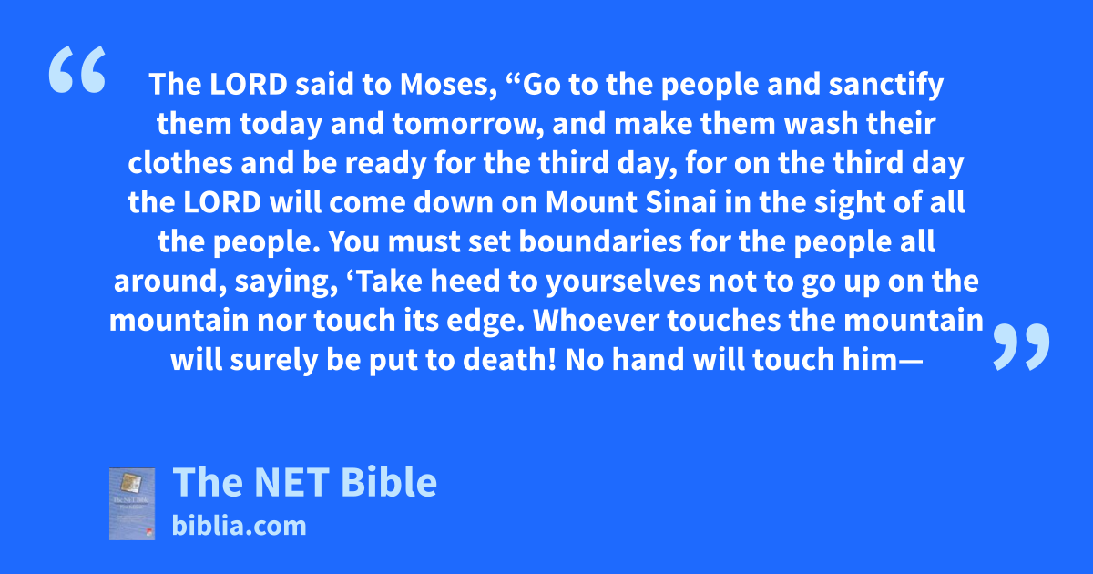 19:10 The Lord said to Moses, “Go to the people and sanctify them21 today and tomorrow, and make them wash22 their clothes 19:11 and be ready for the third day, for on the third day the Lord will come down on Mount Sinai in the sight of all the people. 19:12 You must set boundaries23 for the people all around, saying, ‘Take heed24 to yourselves not to go up on the mountain nor touch its edge. Whoever touches the mountain will surely be put to death! 19:13 No hand will touch him25—but he will surely be stoned or shot through, whether a beast or a human being;26 he must not live.’ When the ram’s horn sounds a long blast they may27 go up on the mountain.”