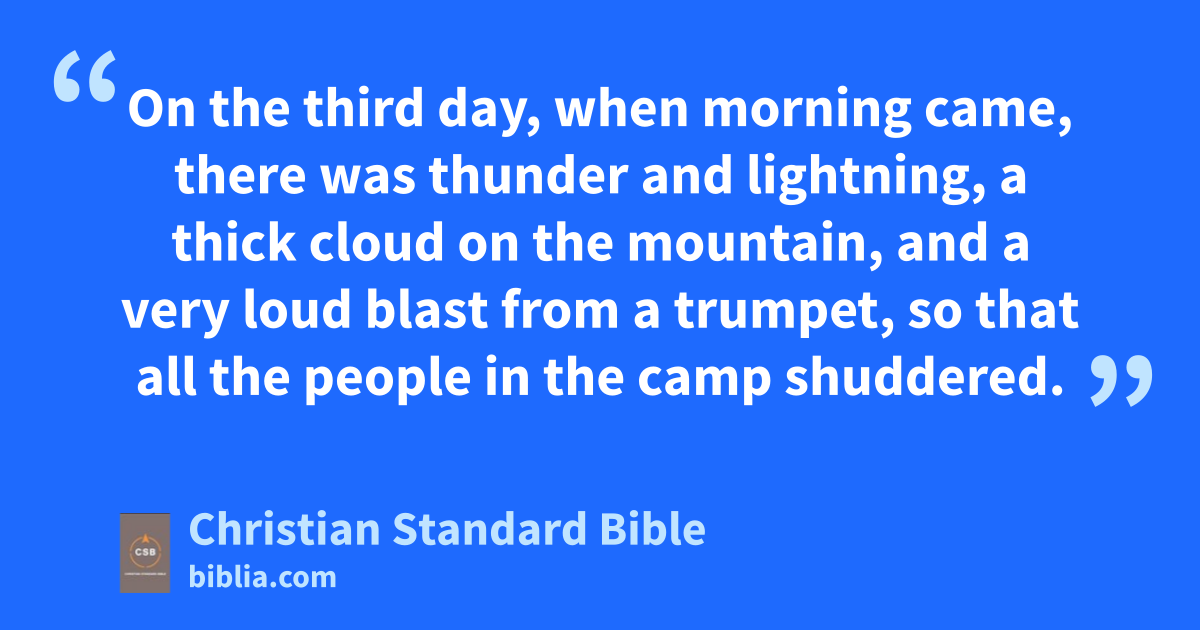 16 On the third day, when morning came, there was thunder and lightning, a thick cloud on the mountain, and a very loud blast from a trumpet, so that all the people in the camp shuddered. 17 Then Moses brought the people out of the camp to meet God, and they stood at the foot of the mountain. 18 Mount Sinai was completely enveloped in smoke because the Lord came down on it in fire.t Its smoke went up like the smoke of a furnace,u and the whole mountain shook violently.v 19 As the sound of the trumpet grew louder and louder, Moses spoke and God answered him in the thunder.w