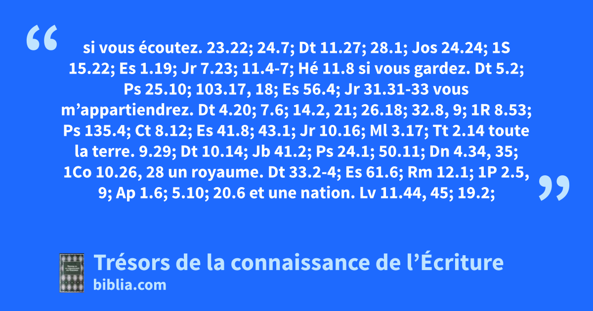 si vous écoutez. 23.22; 24.7; Dt 11.27; 28.1; Jos 24.24; 1S 15.22; Es 1.19; Jr 7.23; 11.4-7; Hé 11.8 si vous gardez. Dt 5.2; Ps 25.10; 103.17, 18; Es 56.4; Jr 31.31-33 vous m’appartiendrez. Dt 4.20; 7.6; 14.2, 21; 26.18; 32.8, 9; 1R 8.53; Ps 135.4; Ct 8.12; Es 41.8; 43.1; Jr 10.16; Ml 3.17; Tt 2.14 toute la terre. 9.29; Dt 10.14; Jb 41.2; Ps 24.1; 50.11; Dn 4.34, 35; 1Co 10.26, 28