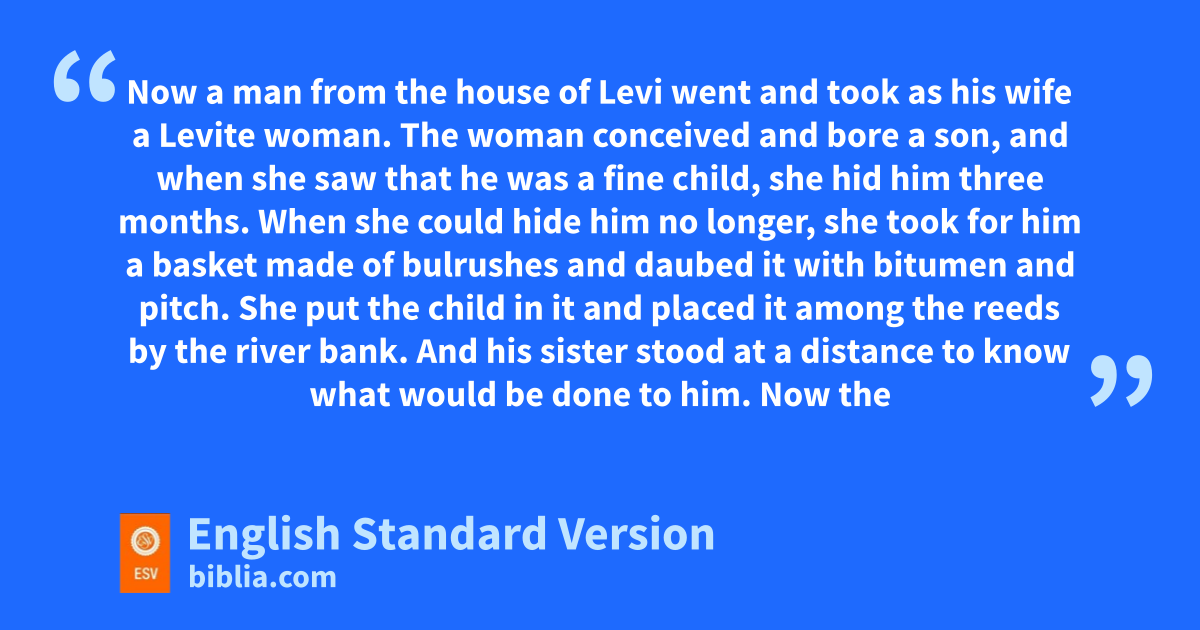2 Now a tman from the house of Levi went and took as his wife a Levite woman. 2 The woman conceived and bore a son, and uwhen she saw that he was a fine child, she hid him three months. 3 When she could hide him no longer, she took for him a basket made of bulrushes1 and daubed it with bitumen and pitch. She put the child in it and placed it among the vreeds by the river bank. 4 And whis sister stood at a distance to know what would be done to him. 5 Now the daughter of Pharaoh came down to bathe at the river, while her young women walked beside the river. She saw the basket among the reeds and sent her servant woman, and she took it. 6 When she opened it, she saw the child, and behold, the baby was crying. She took pity on him and said, “This is one of the Hebrews’ children.” 7 Then his sister said to Pharaoh’s daughter, “Shall I go and call you a nurse from the Hebrew women to nurse the child for you?” 8 And Pharaoh’s daughter said to her, “Go.” So the girl went and called the child’s mother. 9 And Pharaoh’s daughter said to her, “Take this child away and nurse him for me, and I will give you your wages.” So the woman took the child and nursed him. 10 When the child grew older, she brought him to Pharaoh’s daughter, and he became xher son. She named him Moses, “Because,” she said, “I ydrew him out of the water.”2