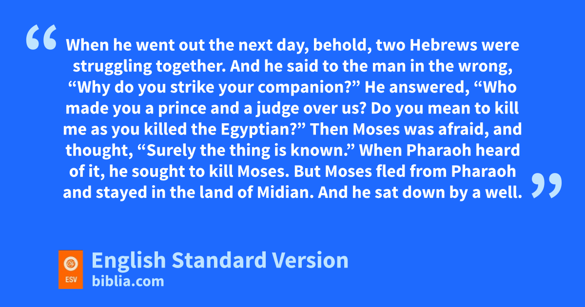 11 One day, zwhen Moses had grown up, he went out to his people and looked on their aburdens, and he saw an Egyptian beating a Hebrew, one of his people.3 12 He looked this way and that, and seeing no one, he bstruck down the Egyptian and hid him in the sand. 13 When che went out the next day, behold, two Hebrews were struggling together. And he said to the man in the wrong, “Why do you strike your companion?” 14 He answered, d“Who made you a prince and a judge over us? Do you mean to kill me as you killed the Egyptian?” Then Moses was afraid, and thought, “Surely the thing is known.” 15 When Pharaoh heard of it, he sought to kill Moses. But eMoses fled from Pharaoh and stayed in the land of Midian. And he sat down by fa well.