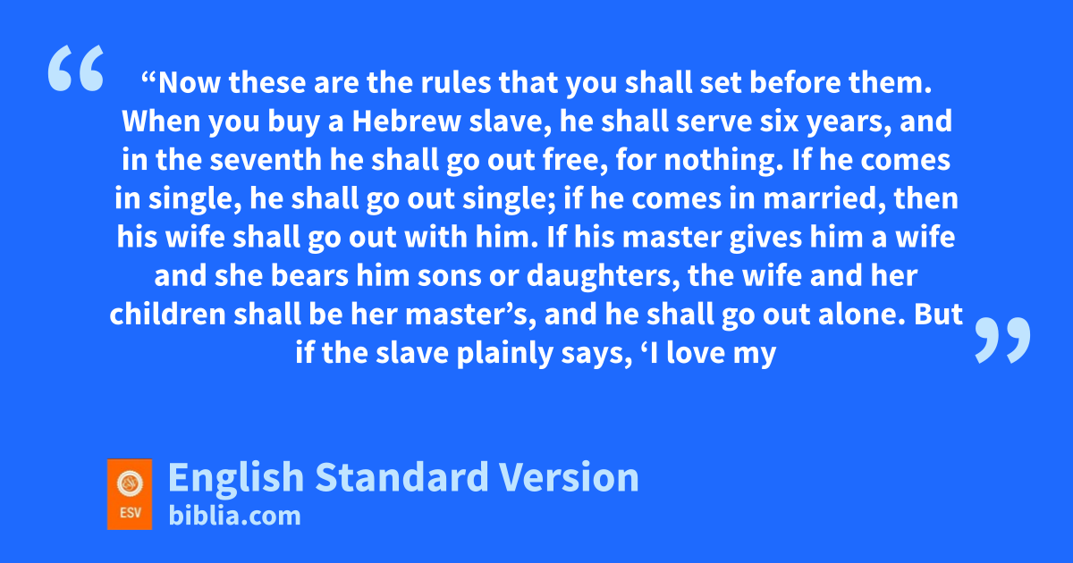 21 “Now these are the hrules that you shall set before them. 2 iWhen you buy a Hebrew slave,1 he shall serve six years, and in the seventh he shall go out free, for nothing. 3 If he comes in single, he shall go out single; if he comes in married, then his wife shall go out with him. 4 If his master gives him a wife and she bears him sons or daughters, the wife and her children shall be her master’s, and he shall go out alone. 5 But jif the slave plainly says, ‘I love my master, my wife, and my children; I will not go out free,’ 6 then his master shall bring him to kGod, and he shall bring him to the door or the doorpost. And his master shall bore his ear through with an awl, and he shall be his slave forever.