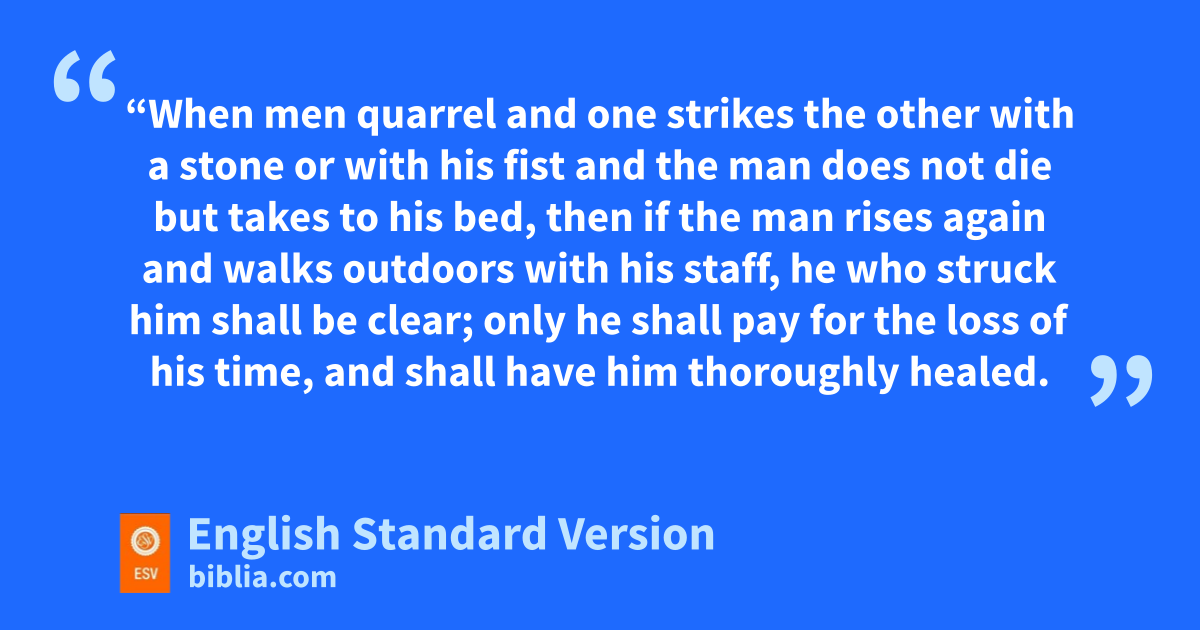 18 “When men quarrel and one strikes the other with a stone or with his fist and the man does not die but takes to his bed, 19 then if the man rises again and walks outdoors with his staff, he who struck him shall be clear; only he shall pay for the loss of his time, and shall have him thoroughly healed.