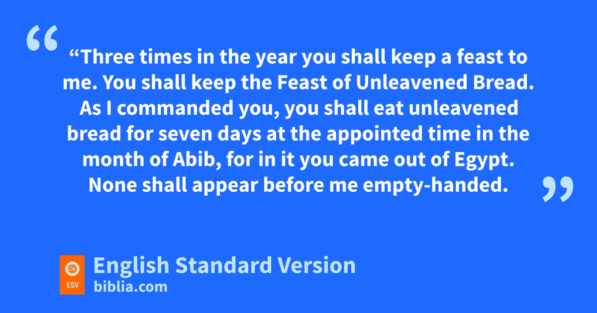 14 p“Three times in the year you shall keep a feast to me. 15 qYou shall keep the Feast of Unleavened Bread. As I commanded you, you shall eat unleavened bread for seven days at the appointed time in the month of rAbib, for in it you came out of Egypt. sNone shall appear before me empty-handed. 16 You shall keep tthe Feast of Harvest, of the firstfruits of your labor, of what you sow in the field. You shall keep the uFeast of Ingathering at the end of the year, when you gather in from the field the fruit of your labor. 17 pThree times in the year shall all your males appear before the Lord God.