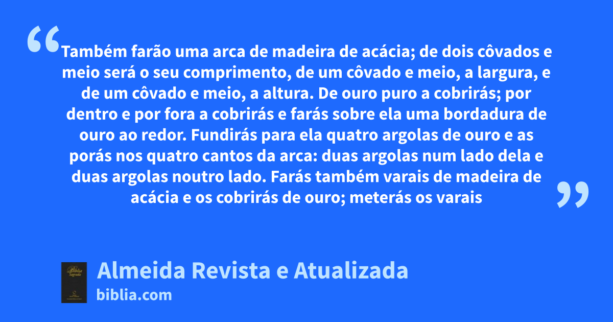 10 Também farão uma arca de madeira de acácia; de dois côvados e meio será o seu comprimento, de um côvado e meio, a largura, e de um côvado e meio, a altura. 11 De ouro puro a cobrirás; por dentro e por fora a cobrirás e farás sobre ela uma bordadura de ouro ao redor. 12 Fundirás para ela quatro argolas de ouro e as porás nos quatro cantos da arca: duas argolas num lado dela e duas argolas noutro lado. 13 Farás também varais de madeira de acácia e os cobrirás de ouro; 14 meterás os varais nas argolas aos lados da arca, para se levar por meio deles a arca. 15 Os varais ficarão nas argolas da arca e não se tirarão dela. 16 E porás na arca o Testemunho, que eu te darei.