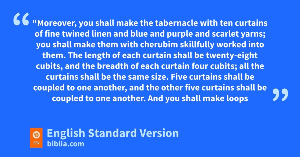 26 “Moreover, xyou shall make the ytabernacle with ten curtains of zfine twined linen and blue and purple and scarlet yarns; you shall make them with cherubim zskillfully worked into them. 2 The length of each curtain shall be twenty-eight cubits,1 and the breadth of each curtain four cubits; all the curtains shall be the same size. 3 Five curtains shall be coupled to one another, and the other five curtains shall be coupled to one another. 4 And you shall make loops of blue on the edge of the outermost curtain in the first set. Likewise you shall make loops on the edge of the outermost curtain in the second set. 5 Fifty loops you shall make on the one curtain, and fifty loops you shall make on the edge of the curtain that is in the second set; the loops shall be opposite one another. 6 And you shall make fifty clasps of gold, and couple the curtains one to the other with the clasps, so that the tabernacle may be a single whole.