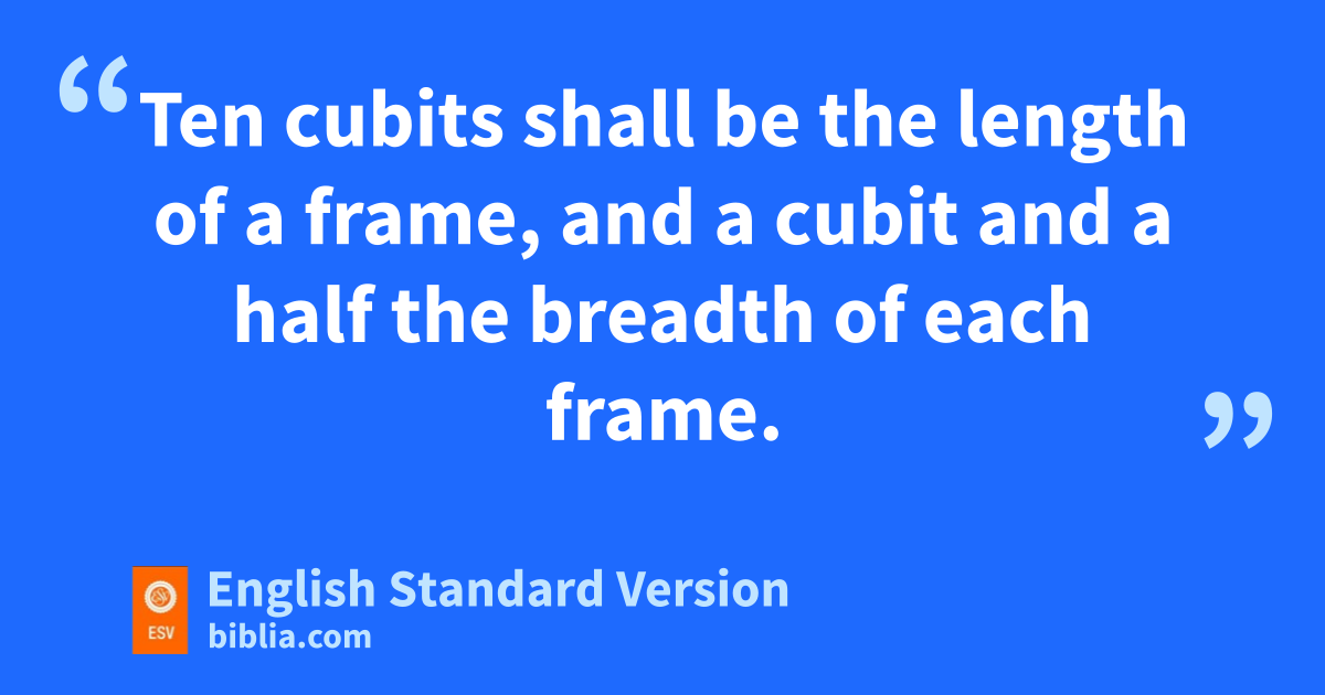 15 “You shall make upright frames for the tabernacle of acacia wood. 16 Ten cubits shall be the length of a frame, and a cubit and a half the breadth of each frame. 17 There shall be two tenons in each frame, for fitting together. So shall you do for all the frames of the tabernacle. 18 You shall make the frames for the tabernacle: twenty frames for the south side; 19 and forty bases of silver you shall make under the twenty frames, two bases under one frame for its two tenons, and two bases under the next frame for its two tenons; 20 and for the second side of the tabernacle, on the north side twenty frames, 21 and their forty bases of silver, two bases under one frame, and two bases under the next frame. 22 And for the rear of the tabernacle westward you shall make six frames. 23 And you shall make two frames for corners of the tabernacle in the rear; 24 they shall be separate beneath, but joined at the top, at the first ring. Thus shall it be with both of them; they shall form the two corners. 25 And there shall be eight frames, with their bases of silver, sixteen bases; two bases under one frame, and two bases under another frame.