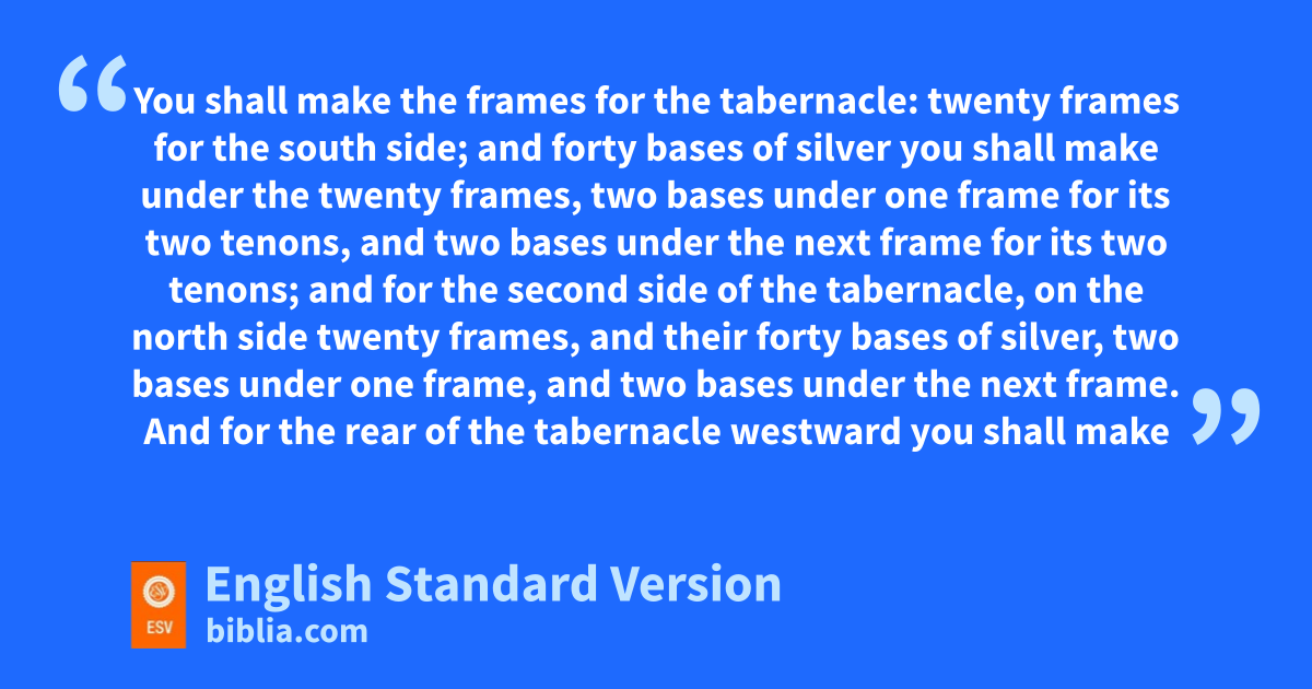 15 “You shall make upright frames for the tabernacle of acacia wood. 16 Ten cubits shall be the length of a frame, and a cubit and a half the breadth of each frame. 17 There shall be two tenons in each frame, for fitting together. So shall you do for all the frames of the tabernacle. 18 You shall make the frames for the tabernacle: twenty frames for the south side; 19 and forty bases of silver you shall make under the twenty frames, two bases under one frame for its two tenons, and two bases under the next frame for its two tenons; 20 and for the second side of the tabernacle, on the north side twenty frames, 21 and their forty bases of silver, two bases under one frame, and two bases under the next frame. 22 And for the rear of the tabernacle westward you shall make six frames. 23 And you shall make two frames for corners of the tabernacle in the rear; 24 they shall be separate beneath, but joined at the top, at the first ring. Thus shall it be with both of them; they shall form the two corners. 25 And there shall be eight frames, with their bases of silver, sixteen bases; two bases under one frame, and two bases under another frame.