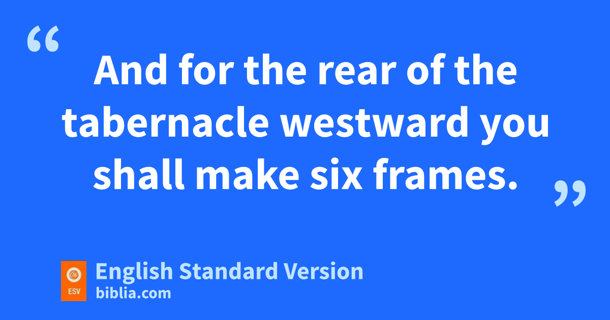 15 “You shall make upright frames for the tabernacle of acacia wood. 16 Ten cubits shall be the length of a frame, and a cubit and a half the breadth of each frame. 17 There shall be two tenons in each frame, for fitting together. So shall you do for all the frames of the tabernacle. 18 You shall make the frames for the tabernacle: twenty frames for the south side; 19 and forty bases of silver you shall make under the twenty frames, two bases under one frame for its two tenons, and two bases under the next frame for its two tenons; 20 and for the second side of the tabernacle, on the north side twenty frames, 21 and their forty bases of silver, two bases under one frame, and two bases under the next frame. 22 And for the rear of the tabernacle westward you shall make six frames. 23 And you shall make two frames for corners of the tabernacle in the rear; 24 they shall be separate beneath, but joined at the top, at the first ring. Thus shall it be with both of them; they shall form the two corners. 25 And there shall be eight frames, with their bases of silver, sixteen bases; two bases under one frame, and two bases under another frame.