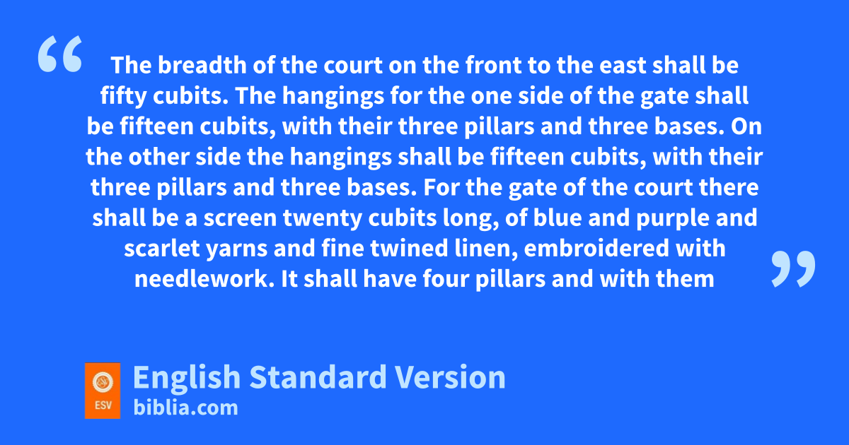 9 s“You shall make the court of the tabernacle. On the south side the court shall have hangings of fine twined linen a hundred cubits long for one side. 10 Its twenty pillars and their twenty bases shall be of bronze, but the hooks of the pillars and their fillets shall be of silver. 11 And likewise for its length on the north side there shall be hangings a hundred cubits long, its pillars twenty and their bases twenty, of bronze, but the hooks of the pillars and their fillets shall be of silver. 12 And for the breadth of the court on the west side there shall be hangings for fifty cubits, with ten pillars and ten bases. 13 The breadth of the court on the front to the east shall be fifty cubits. 14 The hangings for the one side of the gate shall be fifteen cubits, with their three pillars and three bases. 15 On the other side the hangings shall be fifteen cubits, with their three pillars and three bases. 16 For the gate of the court there shall be ta screen twenty cubits long, of blue and purple and scarlet yarns and fine twined linen, embroidered with needlework. It shall have four pillars and with them four bases. 17 All the pillars around the court shall be filleted with silver. Their hooks shall be of silver, and their bases of bronze. 18 The length of the court shall be a hundred cubits, the breadth fifty, and the height five cubits, with hangings of fine twined linen and bases of bronze. 19 All the utensils of the tabernacle for every use, and all its pegs and all the pegs of the court, shall be of bronze.