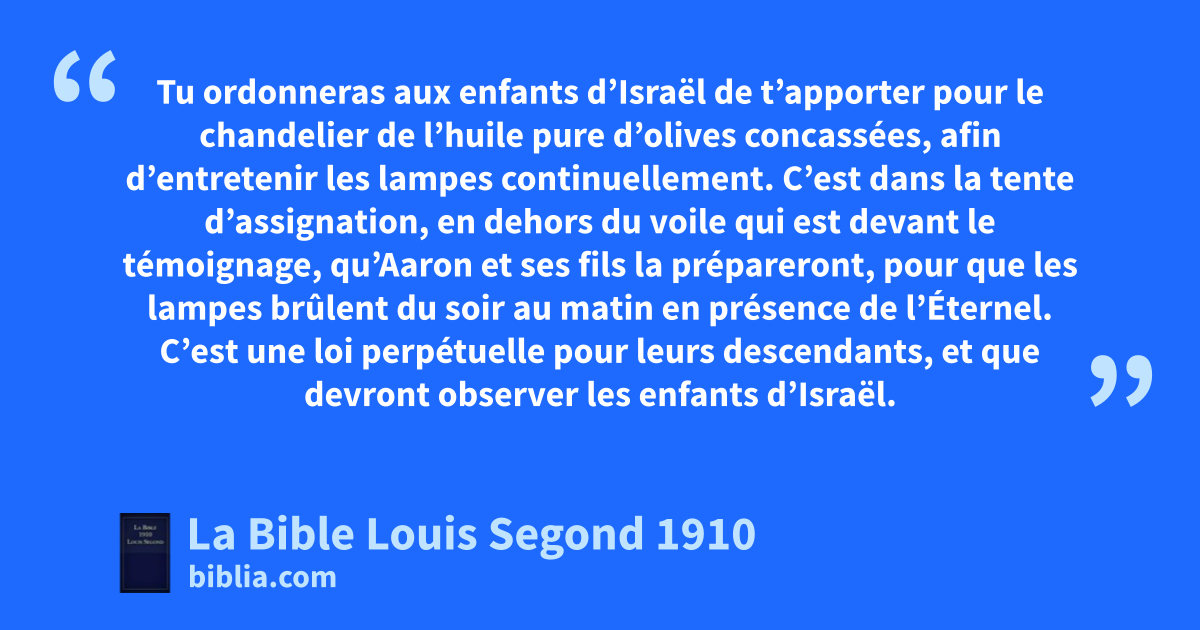 20cTu ordonneras aux enfants d’Israël de t’apporter pour le chandelier de l’huile pure d’olives concassées, afin d’entretenir les lampes continuellement. 21C’est dans la tente d’assignation, en dehors du voile qui est devant le témoignage, qu’Aaron et ses fils la prépareront, pour que les lampes brûlent du soir au matin en présence de l’Éternel. C’est une loi perpétuelle pour leurs descendants, et que devront observer les enfants d’Israël.