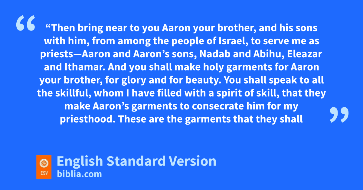 28 “Then bring near to you xAaron your brother, and his sons with him, from among the people of Israel, to serve me as priests—Aaron and Aaron’s sons, yNadab and Abihu, Eleazar and Ithamar. 2 zAnd you shall make holy garments for Aaron your brother, for glory and for beauty. 3 You shall speak to all the askillful, whom I have filled with a spirit of skill, that they make Aaron’s garments to consecrate him for my priesthood. 4 These are the garments that they shall make: a bbreastpiece, an cephod, da robe, ea coat of checker work, ea turban, and ea sash. They shall make holy garments for Aaron your brother and his sons to serve me as priests. 5 They shall receive fgold, blue and purple and scarlet yarns, and fine twined linen.
