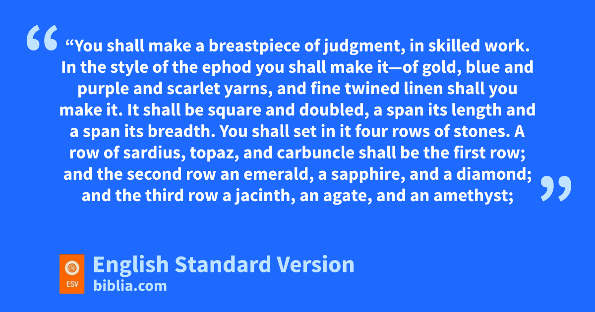 15 k“You shall make a breastpiece of judgment, in skilled work. In the style of the ephod you shall make it—of gold, blue and purple and scarlet yarns, and fine twined linen shall you make it. 16 It shall be square and doubled, a span1 its length and a span its breadth. 17 lYou shall set in it four rows of stones. A row of sardius,2 topaz, and carbuncle shall be the first row; 18 and the second row an emerald, a sapphire, and a diamond; 19 and the third row a jacinth, an agate, and an amethyst; 20 and the fourth row a beryl, an onyx, and a jasper. They shall be set in gold filigree. 21 There shall be twelve stones with their names according to the names of the sons of Israel. They shall be like signets, each engraved with its name, for the twelve tribes. 22 You shall make for the breastpiece twisted chains like cords, of pure gold. 23 And you shall make for the breastpiece two rings of gold, and put the two rings on the two edges of the breastpiece. 24 And you shall put the two cords of gold in the two rings at the edges of the breastpiece. 25 The two ends of the two cords you shall attach to the two settings of filigree, and so attach it in front to the shoulder pieces of the ephod. 26 You shall make two rings of gold, and put them at the two ends of the breastpiece, on its inside edge next to the ephod. 27 And you shall make two rings of gold, and attach them in front to the lower part of the two shoulder pieces of the ephod, at its seam above the mskillfully woven band of the ephod. 28 And they shall bind the breastpiece by its rings to the rings of the ephod with a lace of blue, so that it may lie on the skillfully woven band of the ephod, so that the breastpiece shall not come loose from the ephod. 29 nSo Aaron shall bear the names of the sons of Israel in the breastpiece of judgment on his heart, when he goes into the Holy Place, to bring them to regular oremembrance before the Lord. 30 And in the breastpiece of judgment pyou shall put the Urim and the Thummim, and they shall be on Aaron’s heart, when he goes in before the Lord. Thus Aaron shall bear the judgment of the people of Israel on his heart before the Lord regularly.