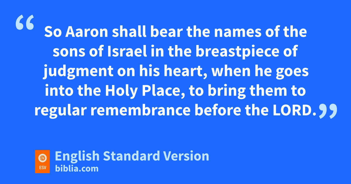 15 k“You shall make a breastpiece of judgment, in skilled work. In the style of the ephod you shall make it—of gold, blue and purple and scarlet yarns, and fine twined linen shall you make it. 16 It shall be square and doubled, a span1 its length and a span its breadth. 17 lYou shall set in it four rows of stones. A row of sardius,2 topaz, and carbuncle shall be the first row; 18 and the second row an emerald, a sapphire, and a diamond; 19 and the third row a jacinth, an agate, and an amethyst; 20 and the fourth row a beryl, an onyx, and a jasper. They shall be set in gold filigree. 21 There shall be twelve stones with their names according to the names of the sons of Israel. They shall be like signets, each engraved with its name, for the twelve tribes. 22 You shall make for the breastpiece twisted chains like cords, of pure gold. 23 And you shall make for the breastpiece two rings of gold, and put the two rings on the two edges of the breastpiece. 24 And you shall put the two cords of gold in the two rings at the edges of the breastpiece. 25 The two ends of the two cords you shall attach to the two settings of filigree, and so attach it in front to the shoulder pieces of the ephod. 26 You shall make two rings of gold, and put them at the two ends of the breastpiece, on its inside edge next to the ephod. 27 And you shall make two rings of gold, and attach them in front to the lower part of the two shoulder pieces of the ephod, at its seam above the mskillfully woven band of the ephod. 28 And they shall bind the breastpiece by its rings to the rings of the ephod with a lace of blue, so that it may lie on the skillfully woven band of the ephod, so that the breastpiece shall not come loose from the ephod. 29 nSo Aaron shall bear the names of the sons of Israel in the breastpiece of judgment on his heart, when he goes into the Holy Place, to bring them to regular oremembrance before the Lord. 30 And in the breastpiece of judgment pyou shall put the Urim and the Thummim, and they shall be on Aaron’s heart, when he goes in before the Lord. Thus Aaron shall bear the judgment of the people of Israel on his heart before the Lord regularly.