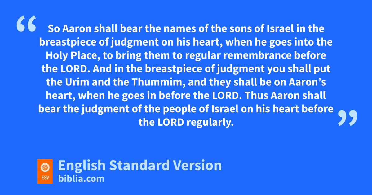 15 k“You shall make a breastpiece of judgment, in skilled work. In the style of the ephod you shall make it—of gold, blue and purple and scarlet yarns, and fine twined linen shall you make it. 16 It shall be square and doubled, a span1 its length and a span its breadth. 17 lYou shall set in it four rows of stones. A row of sardius,2 topaz, and carbuncle shall be the first row; 18 and the second row an emerald, a sapphire, and a diamond; 19 and the third row a jacinth, an agate, and an amethyst; 20 and the fourth row a beryl, an onyx, and a jasper. They shall be set in gold filigree. 21 There shall be twelve stones with their names according to the names of the sons of Israel. They shall be like signets, each engraved with its name, for the twelve tribes. 22 You shall make for the breastpiece twisted chains like cords, of pure gold. 23 And you shall make for the breastpiece two rings of gold, and put the two rings on the two edges of the breastpiece. 24 And you shall put the two cords of gold in the two rings at the edges of the breastpiece. 25 The two ends of the two cords you shall attach to the two settings of filigree, and so attach it in front to the shoulder pieces of the ephod. 26 You shall make two rings of gold, and put them at the two ends of the breastpiece, on its inside edge next to the ephod. 27 And you shall make two rings of gold, and attach them in front to the lower part of the two shoulder pieces of the ephod, at its seam above the mskillfully woven band of the ephod. 28 And they shall bind the breastpiece by its rings to the rings of the ephod with a lace of blue, so that it may lie on the skillfully woven band of the ephod, so that the breastpiece shall not come loose from the ephod. 29 nSo Aaron shall bear the names of the sons of Israel in the breastpiece of judgment on his heart, when he goes into the Holy Place, to bring them to regular oremembrance before the Lord. 30 And in the breastpiece of judgment pyou shall put the Urim and the Thummim, and they shall be on Aaron’s heart, when he goes in before the Lord. Thus Aaron shall bear the judgment of the people of Israel on his heart before the Lord regularly.