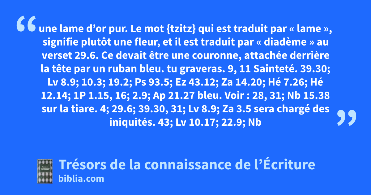 une lame d’or pur. Le mot {tzitz} qui est traduit par « lame », signifie plutôt une fleur, et il est traduit par « diadème » au verset 29.6. Ce devait être une couronne, attachée derrière la tête par un ruban bleu. tu graveras. 9, 11 Sainteté. 39.30; Lv 8.9; 10.3; 19.2; Ps 93.5; Ez 43.12; Za 14.20; Hé 7.26; Hé 12.14; 1P 1.15, 16; 2.9; Ap 21.27