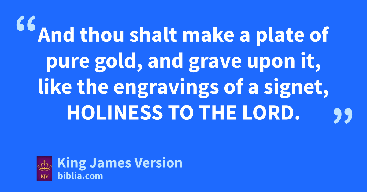 31 And bthou shalt make the robe of the ephod all of blue. 32 And there shall be an hole in the top of it, in the midst thereof: it shall have a binding of woven work round about the hole of it, as it were the hole of an habergeon, cthat it be not rent. 33 And beneath upon the ||hem of it thou shalt make pomegranates of blue, and of purple, and of scarlet, round about the hem thereof; and bells of gold between them round about: 34 A golden bell and a pomegranate, a golden bell and a pomegranate, upon the hem of the robe round about. 35 dAnd it shall be upon Aaron to minister: and his sound shall be heard when he goeth in unto the holy place before the Lord, and when he cometh out, that he die not. 36 And thou shalt make ea plate of pure gold, and grave upon it, like fthe engravings of a signet, gHOLINESS TO THE LORD. 37 And thou shalt put it on a blue lace, that it may be upon the hmitre; upon the forefront of the mitre it shall be. 38 And it shall be upon Aaron’s forehead, that Aaron may ibear the iniquity of the holy things, which the children of Israel shall hallow in all their holy gifts; and it shall be always upon his forehead, that they may be kaccepted before the Lord.