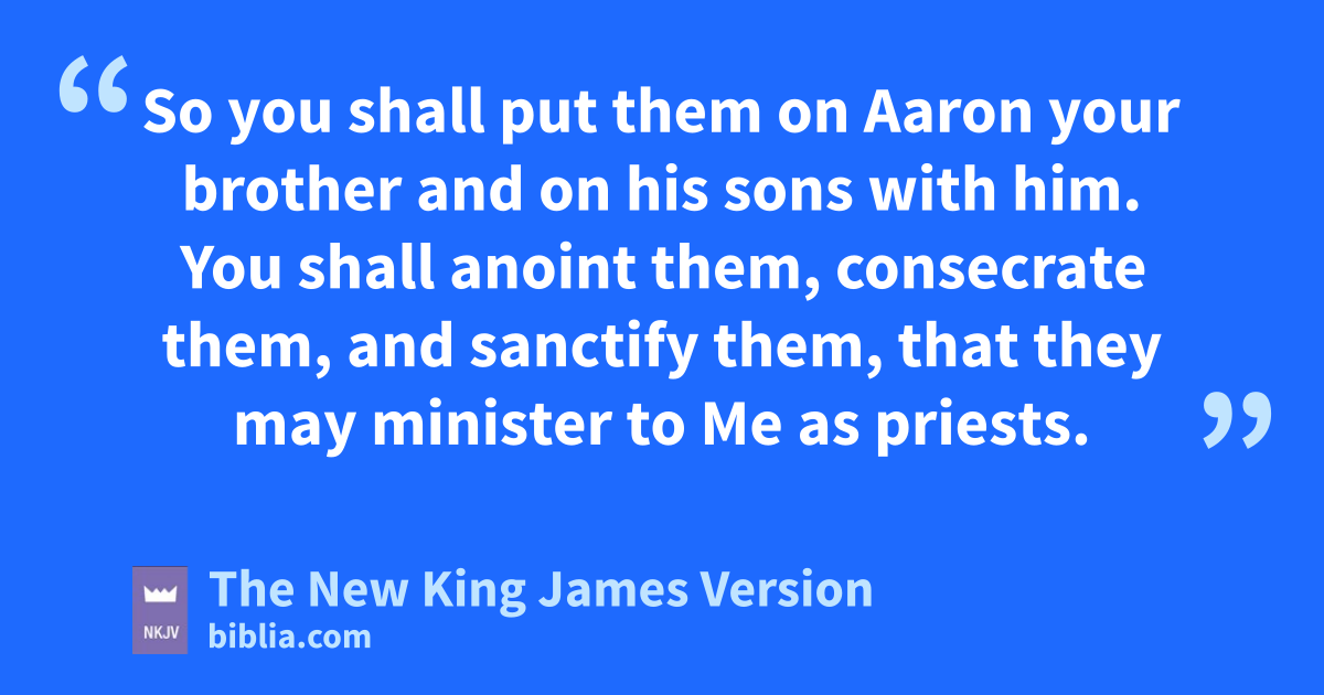 40 b“For Aaron’s sons you shall make tunics, and you shall make sashes for them. And you shall make 2hats for them, for glory and cbeauty. 41 So you shall put them on Aaron your brother and on his sons with him. You shall danoint them, econsecrate them, and 3sanctify them, that they may minister to Me as priests. 42 And you shall make ffor them linen trousers to cover their 4nakedness; they shall 5reach from the waist to the thighs. 43 They shall be on Aaron and on his sons when they come into the tabernacle of meeting, or when they come near gthe altar to minister in the holy place, that they hdo not incur 6iniquity and die. iIt shall be a statute forever to him and his descendants after him.
