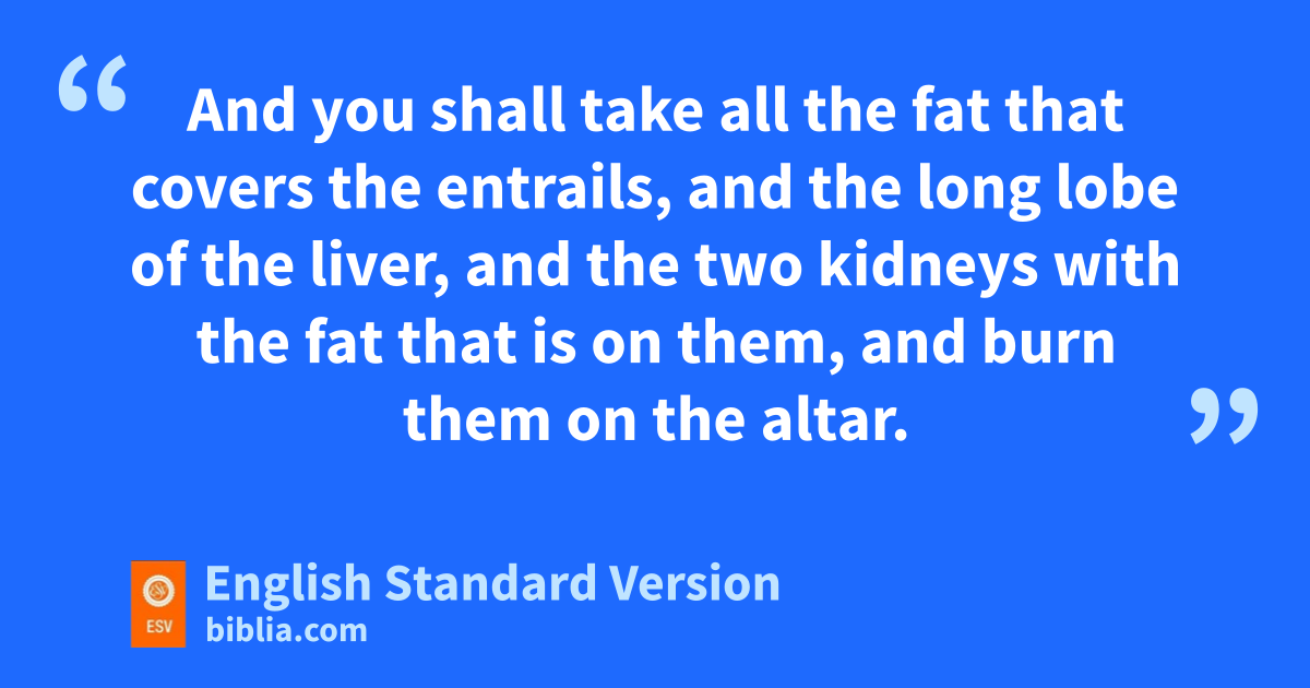 10 “Then you shall bring the bull before the tent of meeting. mAaron and his sons shall lay their hands on the head of the bull. 11 Then you shall kill the bull before the Lord at the entrance of the tent of meeting, 12 and nshall take part of the blood of the bull and put it on the ohorns of the altar with your finger, and the rest of1 the blood you shall pour out at the base of the altar. 13 And you shall take all pthe fat that covers the entrails, and the long lobe of the liver, and the two kidneys with the fat that is on them, and burn them on the altar. 14 But the flesh of the bull and its skin and its dung you shall burn with fire qoutside the camp; rit is a sin offering.