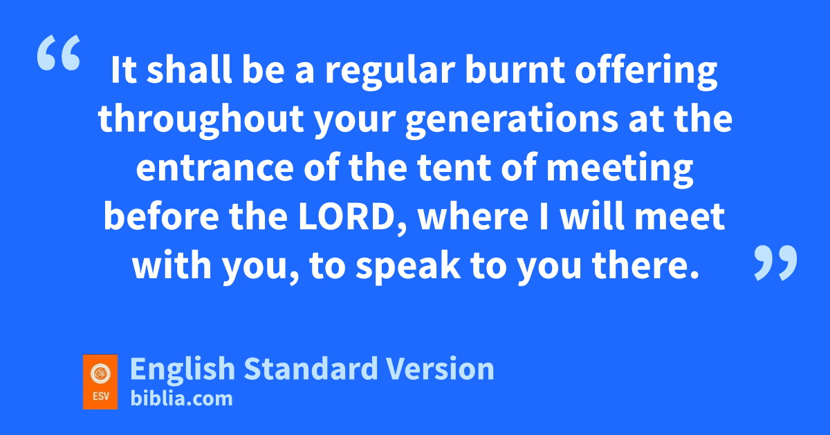 38 “Now this is what you shall offer on the altar: xtwo lambs a year old yday by day regularly. 39 One lamb you shall offer zin the morning, and the other lamb you shall offer aat twilight. 40 And with the first lamb a tenth measure3 of fine flour mingled with a fourth of a hin4 of beaten oil, and a fourth of a hin of wine for a drink offering. 41 The other lamb you shall offer aat twilight, and shall offer with it a grain offering and its drink offering, as bin the morning, for a cpleasing aroma, a food offering to the Lord. 42 It shall be a dregular burnt offering throughout your generations at the entrance of the tent of meeting before the Lord, ewhere I will meet with you, to speak to you there. 43 There I will meet with the people of Israel, and it shall be fsanctified by my glory. 44 I will consecrate the tent of meeting and the altar. gAaron also and his sons I will consecrate to serve me as priests. 45 hI will dwell among the people of Israel and will be their God. 46 And they shall know that iI am the Lord their God, who brought them out of the land of Egypt that I might dwell among them. I am the Lord their God.