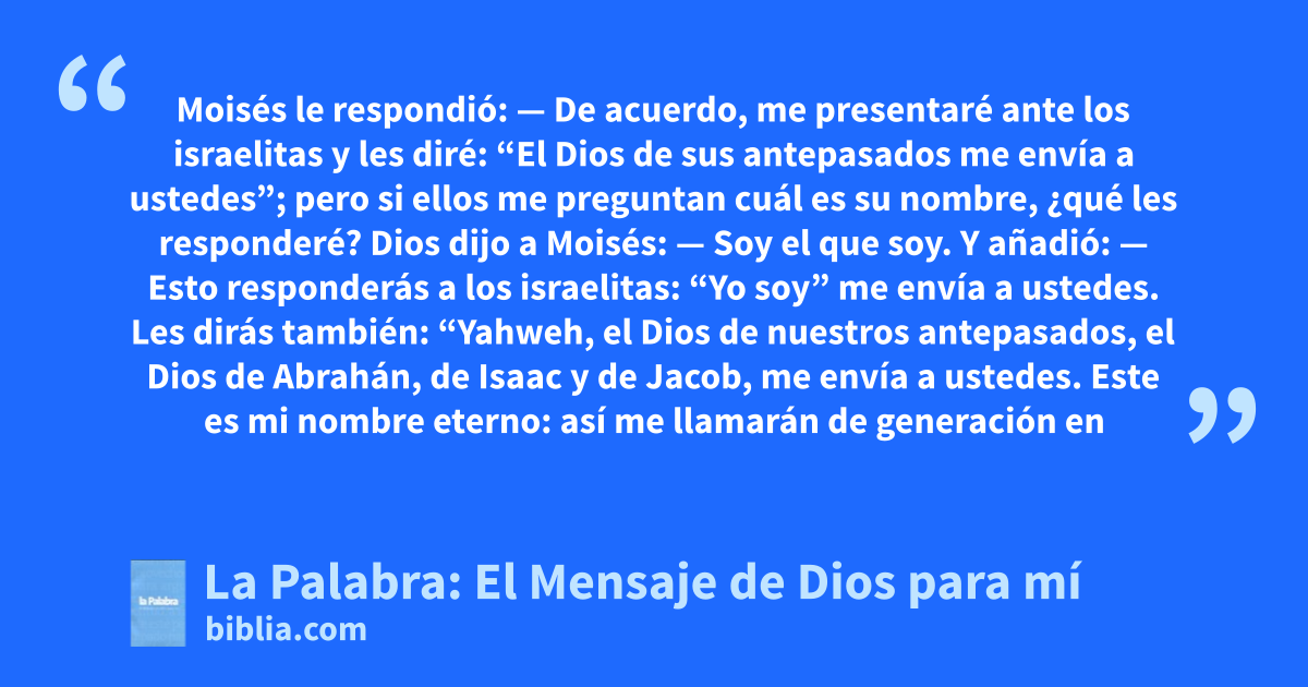 — Esto responderás a los israelitas: “Yo soy” me envía a ustedes. 15 Les dirás también: “Yahweh, el Dios de nuestros antepasados, el Dios de Abrahán, de Isaac y de Jacob, me envía a ustedes. Este es mi nombre eterno: así me llamarán de generación en generación”. 16 Reúne, pues, a los ancianos de Israel y diles: “El Señor, el Dios de sus antepasados, el Dios de Abrahán, de Isaac y de Jacob, se me ha aparecido y me ha dicho: Los he visitado y he observado cómo los tratan los egipcios; 17 así que he determinado acabar con sus penalidades y llevarlos al país de los cananeos, hititas, amorreos, fereceos, jeveos y jebuseos, a una tierra que mana leche y miel”. 18 Ellos te harán caso. Entonces, tú y los ancianos de Israel se presentarán al rey de Egipto, y le dirán: “El Señor, el Dios de los hebreos, ha salido a nuestro encuentro. Permítenos que nos adentremos durante tres días por el desierto para ofrecer sacrificios al Señor, nuestro Dios”. 19 Yo sé que el rey de Egipto no los dejará marchar, a no ser por la fuerza. 20 Pero yo desplegaré mi poder y heriré a Egipto valiéndome de toda clase de prodigios, hasta que el faraón los deje marchar. 21 Además, haré que este pueblo se gane el favor de los egipcios, de modo que cuando salgan no lo hagan con las manos vacías, 22 sino que cada mujer pedirá a su vecina o a las dueñas de la casas donde se alojan, objetos que sean de plata y oro, y ropas para vestir a sus hijos e hijas. Así será como despojarán a los egipcios.