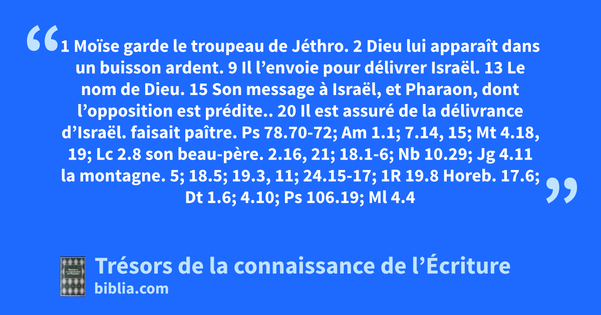 1 Moïse garde le troupeau de Jéthro. 2 Dieu lui apparaît dans un buisson ardent. 9 Il l’envoie pour délivrer Israël. 13 Le nom de Dieu. 15 Son message à Israël, et Pharaon, dont l’opposition est prédite.. 20 Il est assuré de la délivrance d’Israël.