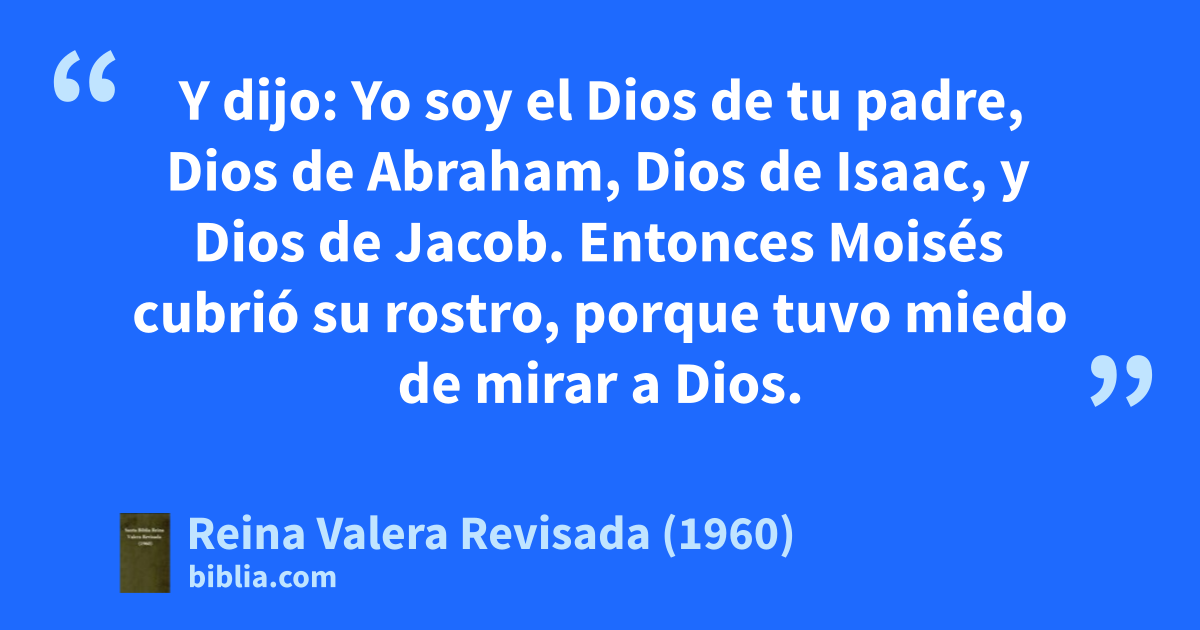 1Apacentando Moisés las ovejas de Jetro su suegro, sacerdote de Madián, llevó las ovejas a través del desierto, y llegó hasta Horeb, monte de Dios. 2Y se le apareció el Angel de Jehová en una llama de fuego en medio de una zarza;a y él miró, y vio que la zarza ardía en fuego, y la zarza no se consumía. 3Entonces Moisés dijo: Iré yo ahora y veré esta grande visión, por qué causa la zarza no se quema. 4Viendo Jehová que él iba a ver, lo llamó Dios de en medio de la zarza, y dijo: ¡Moisés, Moisés! Y él respondió: Heme aquí. 5Y dijo: No te acerques; quita tu calzado de tus pies, porque el lugar en que tú estás, tierra santa es. 6Y dijo: Yo soy el Dios de tu padre, Dios de Abraham, Dios de Isaac, y Dios de Jacob. Entonces Moisés cubrió su rostro, porque tuvo miedo de mirar a Dios.