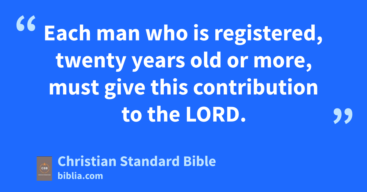 11 The Lord spoke to Moses: 12 “When you take a censush of the Israelites to register them, each of the men must pay a ransomi for his life to the Lord as they are registered. Then no plaguej will come on them as they are registered. 13 Everyone who is registered must pay half a shekelA according to the sanctuary shekel (twenty gerahs to the shekel). This half shekel is a contribution to the Lord.k 14 Each man who is registered, twenty years old or more, must give this contribution to the Lord. 15 The wealthy may not give more and the poor may not give lessl than half a shekel when giving the contribution to the Lord to atone for* your lives. 16 Take the atonement priceC from the Israelites and use it for the service of the tent of meeting. It will serve as a reminder for the Israelites before the Lord to atone for your lives.”m