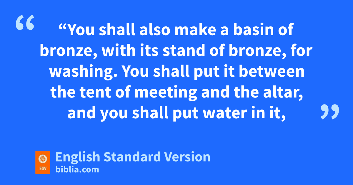 17 The Lord said to Moses, 18 “You shall also make a bbasin of bronze, with its stand of bronze, for washing. bYou shall put it between the tent of meeting and the altar, and you shall put water in it, 19 with which Aaron and his sons cshall wash their hands and their feet. 20 When they go into the tent of meeting, or when they come near the altar to minister, to burn a food offering4 to the Lord, they shall wash with water, so that they may not die. 21 They shall wash their hands and their feet, so that they may not die. It shall dbe a statute forever to them, even to him and to his offspring throughout their generations.”