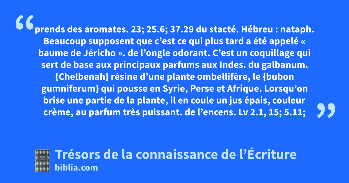prends des aromates. 23; 25.6; 37.29 du stacté. Hébreu : nataph. Beaucoup supposent que c’est ce qui plus tard a été appelé « baume de Jéricho ». de l’ongle odorant. C’est un coquillage qui sert de base aux principaux parfums aux Indes. du galbanum. {Chelbenah} résine d’une plante ombellifère, le {bubon gumniferum} qui pousse en Syrie, Perse et Afrique. Lorsqu’on brise une partie de la plante, il en coule un jus épais, couleur crème, au parfum très puissant. de l’encens. Lv 2.1, 15; 5.11; 24.7; 1Ch 9.29, 30; Né 13.5; Ct 3.6; Mt 2.11