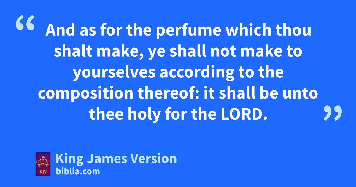 22 Moreover the Lord spake unto Moses, saying, 23 Take thou also unto thee xprincipal spices, of pure ymyrrh five hundred shekels, and of sweet zcinnamon half so much, even two hundred and fifty shekels, and of sweet acalamus two hundred and fifty shekels, 24 And of acassia five hundred shekels, after the shekel of the sanctuary, and of oil olive an bhin: 25 And thou shalt make it an oil of holy ointment, an ointment compound after the art of the ||apothecary: it shall be can holy anointing oil. 26 dAnd thou shalt anoint the tabernacle of the congregation therewith, and the ark of the testimony, 27 And the table and all his vessels, and the candlestick and his vessels, and the altar of incense, 28 And the altar of burnt offering with all his vessels, and the laver and his foot. 29 And thou shalt sanctify them, that they may be most holy: ewhatsoever toucheth them shall be holy. 30 fAnd thou shalt anoint Aaron and his sons, and consecrate them, that they may minister unto me in the priest’s office. 31 And thou shalt speak unto the children of Israel, saying, This shall be an holy anointing oil unto me throughout your generations. 32 Upon man’s flesh shall it not be poured, neither shall ye make any other like it, after the composition of it: git is holy, and it shall be holy unto you. 33 hWhosoever compoundeth any like it, or whosoever putteth any of it upon a stranger, ishall even be cut off from his people. 34 And the Lord said unto Moses, kTake unto thee sweet spices, stacte, and onycha, and galbanum; these sweet spices with pure frankincense: of each shall there be a like weight: 35 And thou shalt make it a perfume, a confection lafter the art of the apothecary, †tempered together, pure and holy: 36 And thou shalt beat some of it very small, and put of it before the testimony in the tabernacle of the congregation, mwhere I will meet with thee: nit shall be unto you most holy. 37 And as for the perfume which thou shalt make, oye shall not make to yourselves according to the composition thereof: it shall be unto thee holy for the Lord. 38 pWhosoever shall make like unto that, to smell thereto, shall even be cut off from his people.