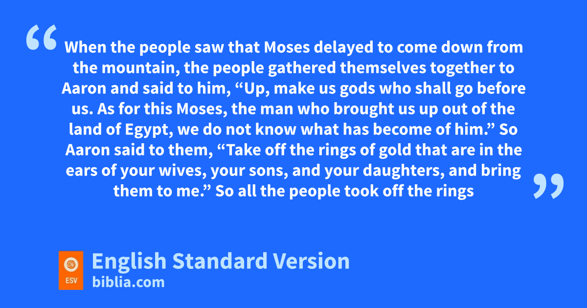 32 When the people saw that Moses vdelayed to come down from the mountain, the people gathered themselves together to Aaron and said to him, w“Up, make us gods who shall xgo before us. As for this Moses, the man who brought us up out of the land of Egypt, we do not know what has become of him.” 2 So Aaron said to them, “Take off the yrings of gold that are in the ears of your wives, your sons, and your daughters, and bring them to me.” 3 So all the people took off the rings of gold that were in their ears and brought them to Aaron. 4 zAnd he received the gold from their hand and fashioned it with a graving tool and made a golden1 calf. And they said, a“These are your gods, O Israel, who brought you up out of the land of Egypt!” 5 When Aaron saw this, he built an altar before it. And Aaron bmade a proclamation and said, “Tomorrow shall be a feast to the Lord.” 6 And they rose up early the next day and offered burnt offerings and brought peace offerings. And cthe people sat down to eat and drink and rose up dto play.