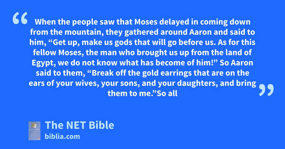 32:1 1 When the people saw that Moses delayed2 in coming down3 from the mountain, they4 gathered around Aaron and said to him, “Get up,5 make us gods6 that will go before us. As for this fellow Moses,7 the man who brought us up from the land of Egypt, we do not know what8 has become of him!”